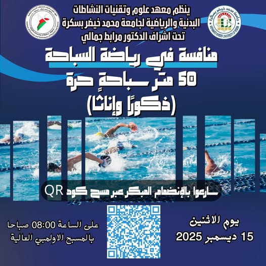 يسر معهد علوم وتقنيات النشاطات البدنية والرياضية – بجامعة بسكرة دعوة طلبته للمشاركة في منافسة رياضية تنافسية في السباحة ، الموجهة لكل طلبة المعهد (ذكورًا وإناثًا) ممن لهم القدرة على المنافسة والراغبين في إبراز مهاراتهم وقدراتهم البدنية. وذلك يوم الاثنين 15 ديسمبر 2025 الساعة الثامنة صباحا بالمسبح الأولمبي العالية، على مسافة 50 متر سباحة حرة.