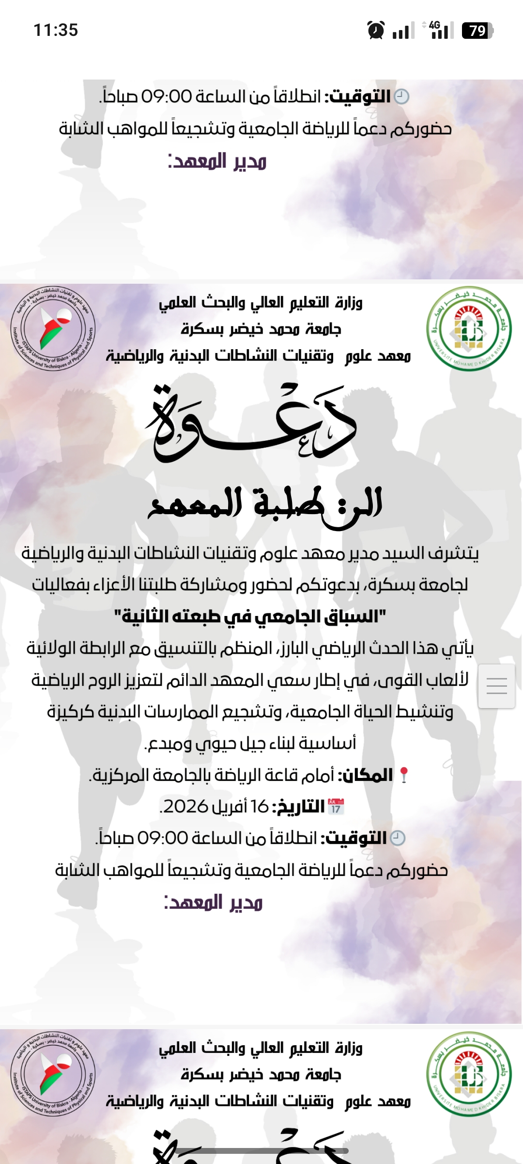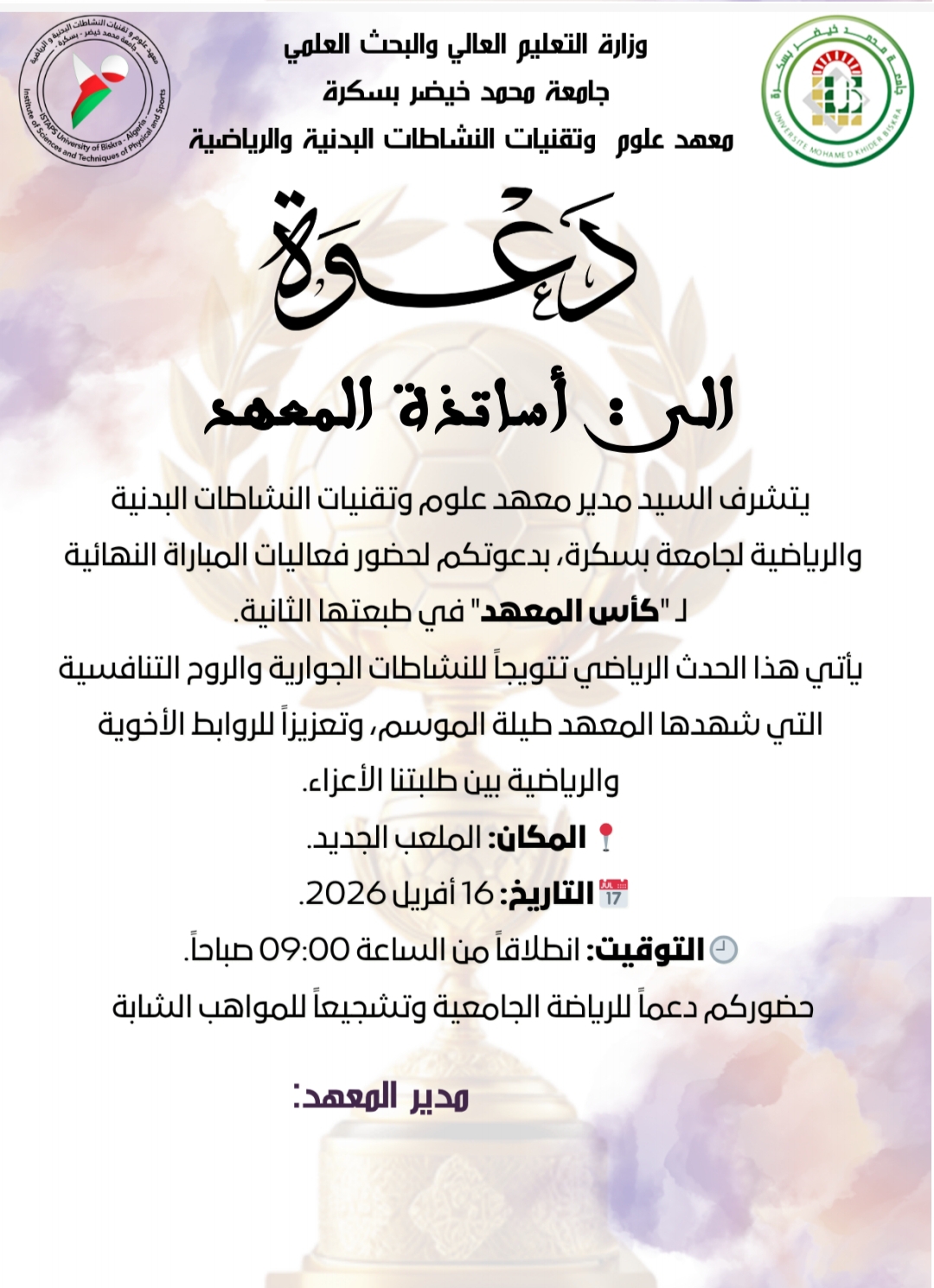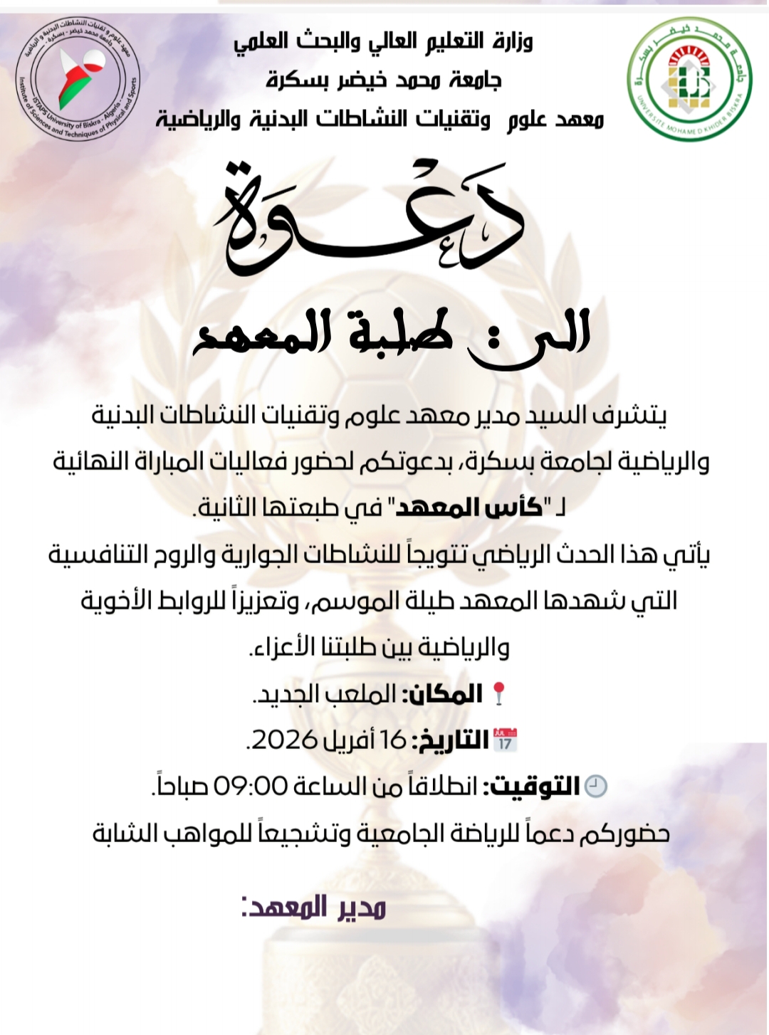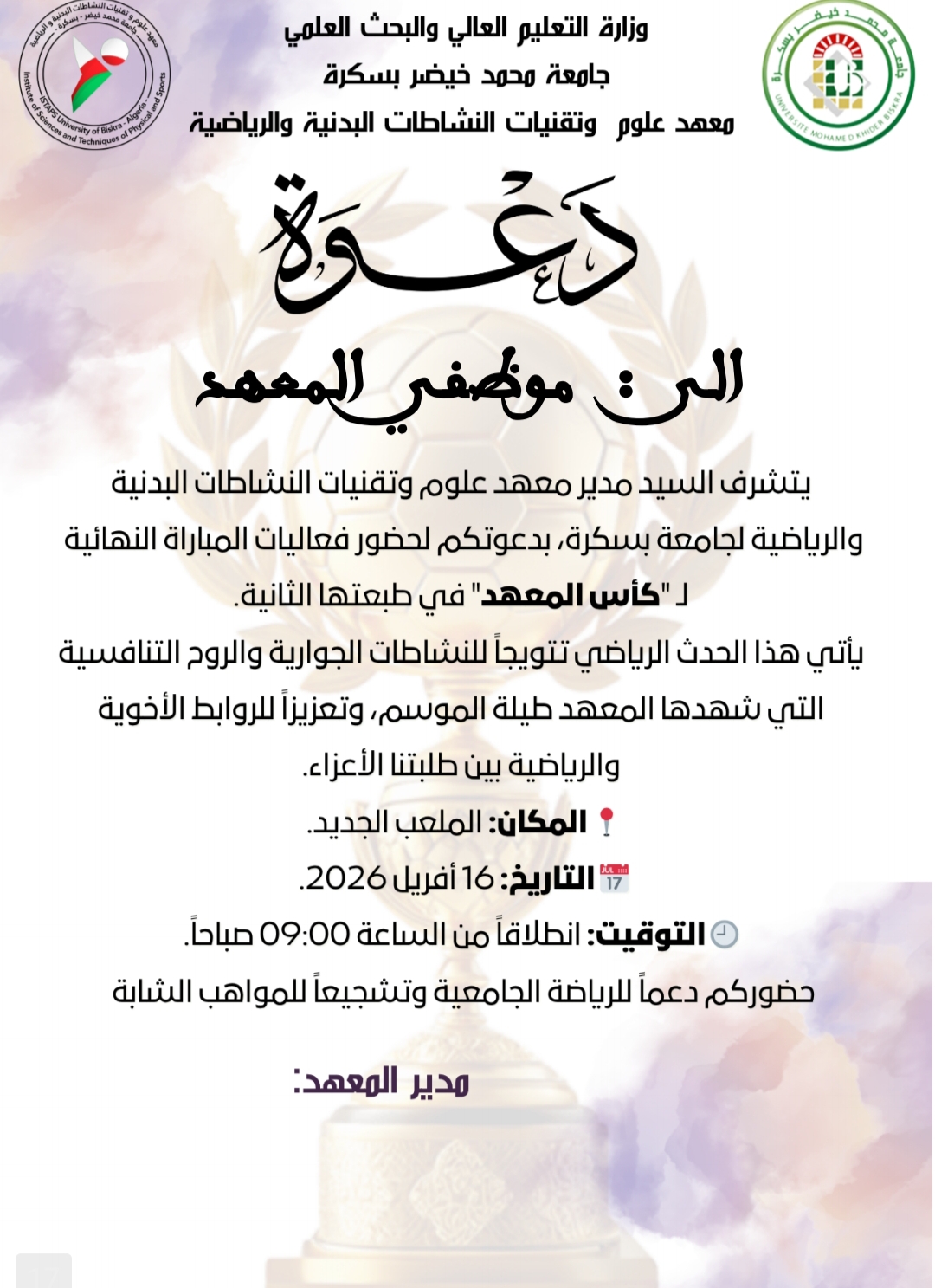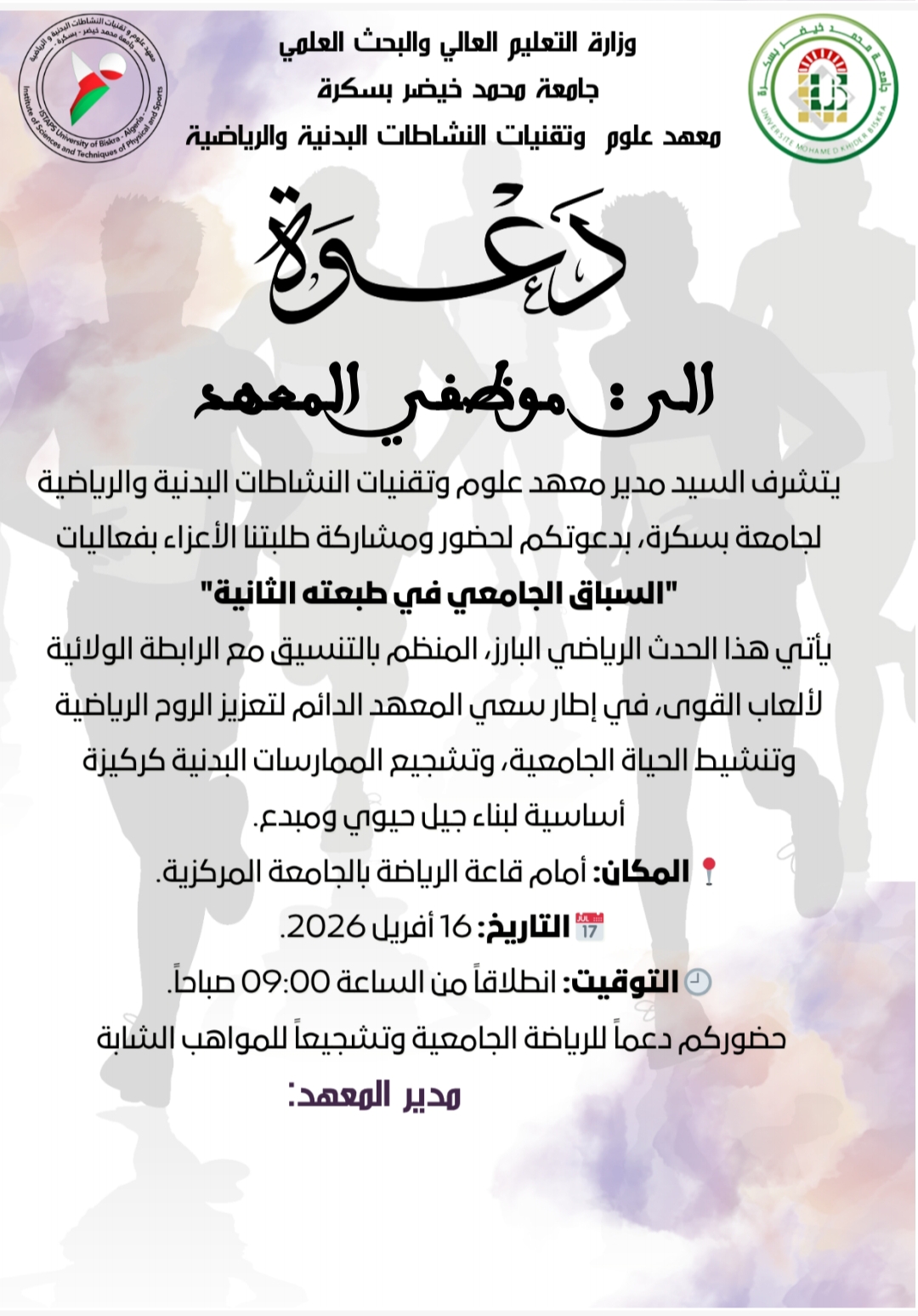 هذه دعوات خاصة بــــ السباق الجامعي الطبعة الثانية ونهائي كأس المعهد الطبعة الثانية - مرسلة الى الطلبة و الأساتذة و الموظفين: