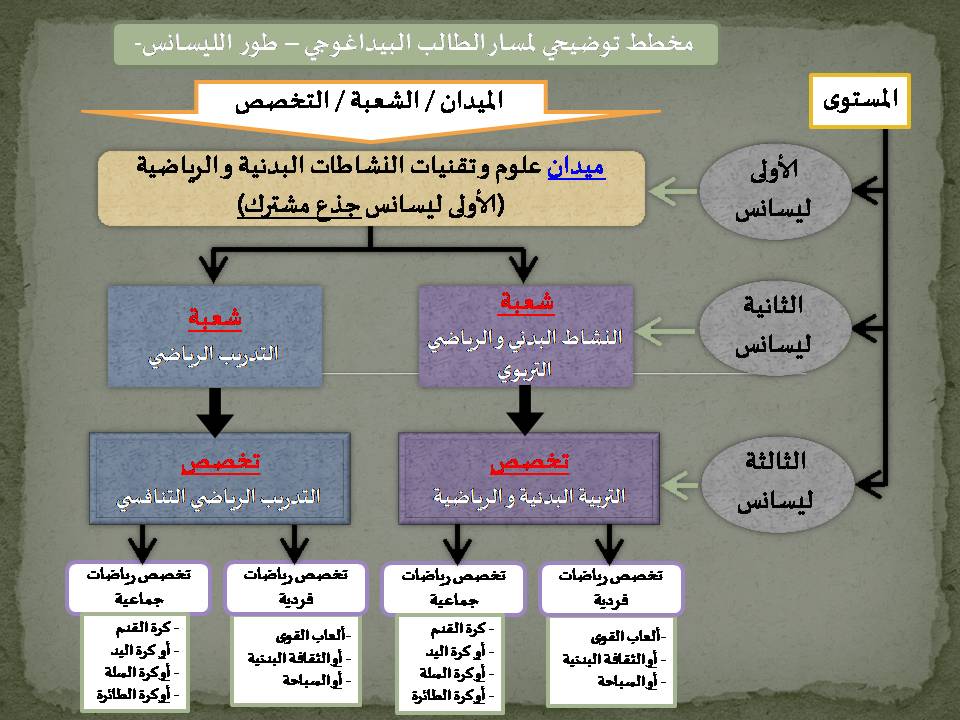 الى جميع طلبة الليسانس تجدون في الملف التالي مخطط توضيحي لمسار الطالب في طور الليسانس ، وعليه يجب على كل طالب الاطلاع جيدا على الشعب و التخصصات الموجودة لانه أثناء ملئ استمارة الرغبات فانه لا يسمح بتغيير الشعبة و التخصص. تحميل المخطط التوضيحي